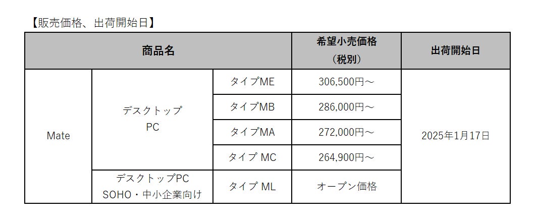 NECは、インテル第14世代CPUとDDR5メモリの採用による基本性能の強化に加え、AIの活用を促進する「Copilotキー」やメンテナンスの手間を軽減する「ハードウェアスキャン機能」の搭載などにより利便性を向上したビジネス向けデスクトップPC「Mate」シリーズの新商品5タイプ31モデルを本日より販売開始します。