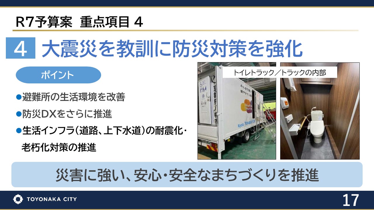 予算案 重点項目4「大震災を教訓に防災対策を強化」