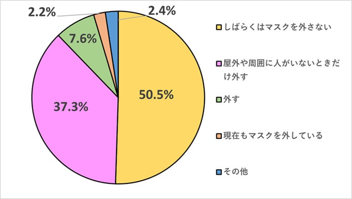 新型コロナウイルスが「5類感染症」に移行した場合、マスクを外しますか?」という回答に対して、「しばらくはマスクを外さない」と回答した方が50.5%と約2人に1人はそのままマスクをつけるようです。