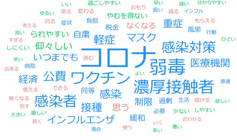 「よいと思う」という理由で多かったのは、「コロナ」除いて、「弱毒」や「ワクチン」でした。新型コロナウイルスが弱毒になってきたこと、ワクチンを接種しているからなどがあげられるでしょう。