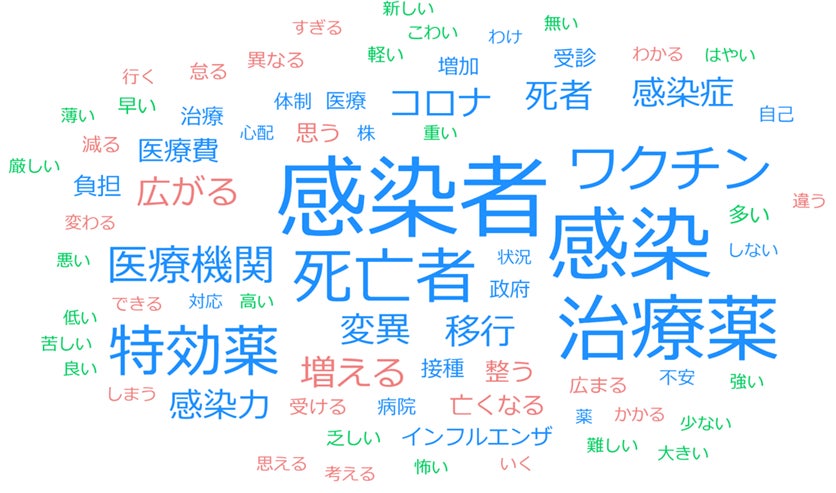 「どちらともいえない」という理由で多かったのは、「コロナ」除いて、「感染」や「感染者」、「変異」でした。新型コロナウイルスが変異していること、季節によって感染者数が変動していることなどがあげられるでしょう。