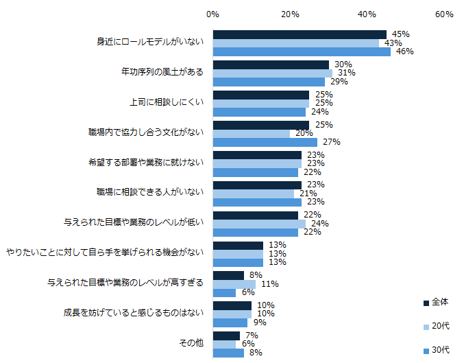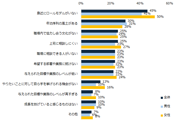 現在の職場で、自身の成長を妨げていると感じるものがあるかを伺うと、「身近にロールモデルがいない」が45%で最多でした。男性よりも女性のほうが身近なロールモデルを重視している方が多いことが分かります(男性:41%、女性50%)。