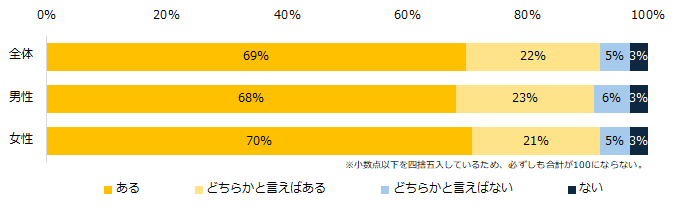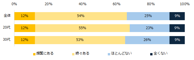 現在、仕事を通じた成長実感があるかを伺うと、66%が「ある」(頻繁にある:12%、時々ある:54%)、34%が「ない」(ほとんどない:25%、全くない:9%)と回答しました。続いて、仕事を通じた成長実感が「ほとんどない」「全くない」と回答した方に、それが理由で転職を考えたことがあるかを伺うと、考えたことが「ある」方は91%でした(ある:69%、どちらかと言えばある:22%)。