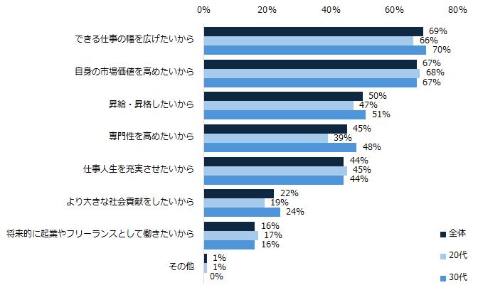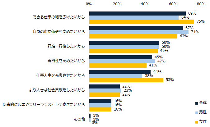 企業選びの際に、成長環境の有無を「重視する」「どちらかと言えば重視する」と回答した方に理由を伺うと、上位は「できる仕事の幅を広げたいから」(69%)、「自身の市場価値を高めたいから」(67%)でした。第3位の回答は男女で異なる結果に。男性は「昇給・昇格したいから」(50%)の一方、女性は「仕事人生を充実させたいから」(53%)がランクインしました。