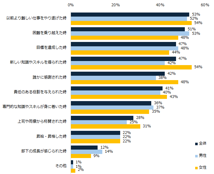 現在、仕事を通じた成長実感が「頻繁にある」「時々ある」と回答した方に、どのような時に自分自身の成長を感じるかを伺うと、トップは「以前より難しい仕事をやり遂げた時」(53%)でした。男女別で見ると、男性は「困難を乗り越えた時」が53%でトップに、女性は「以前より難しい仕事をやり遂げた時」「新しい知識やスキルを得られた時」が同率54%で最多でした。実際に仕事を通じて成長を感じた具体的なエピソードについても紹介します。