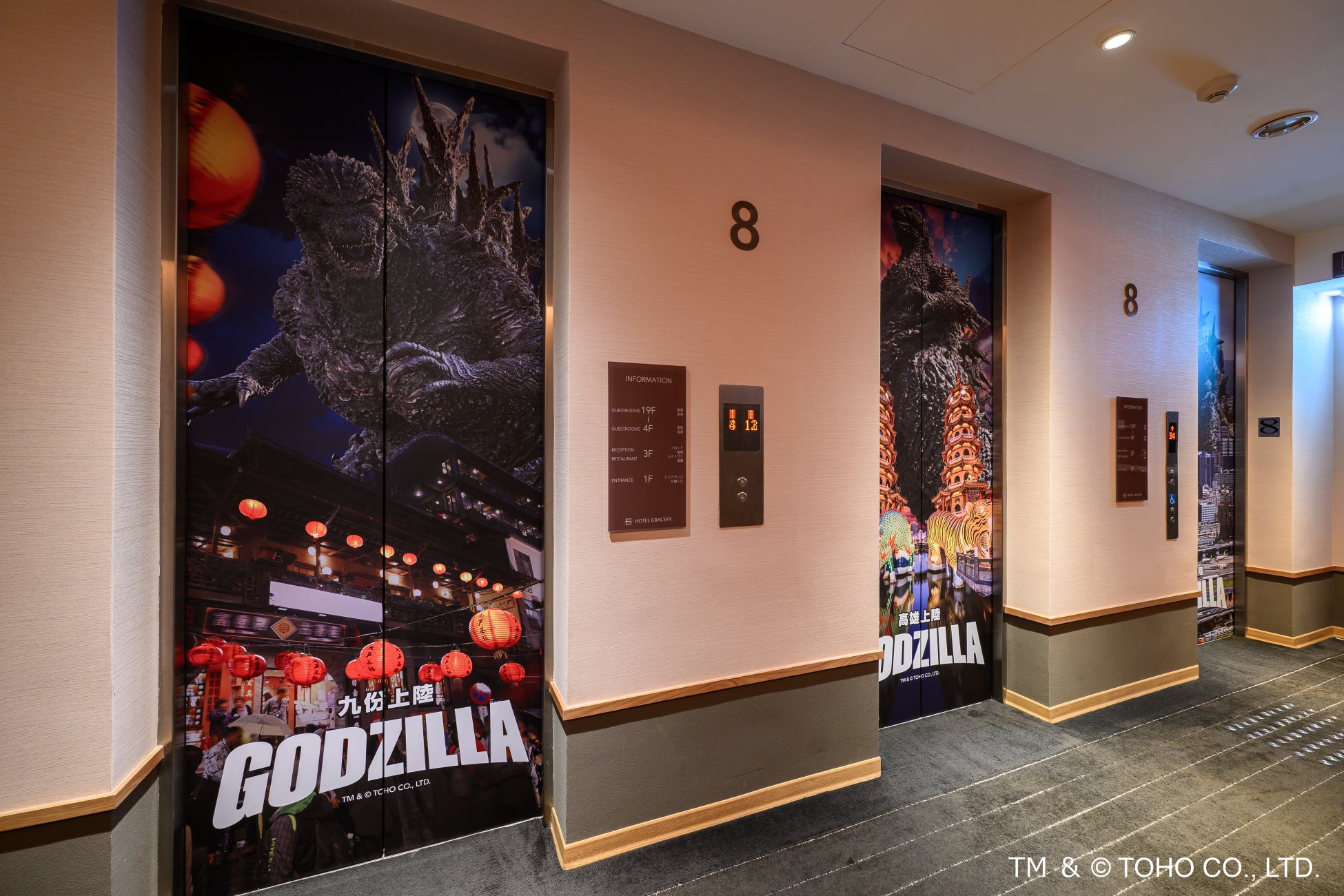 また、フロントやエレベーターなど、ホテル館内もゴジラデザインに変身。さらにゴジラルームを予約されたお客様には、日本の新聞社の緊急号外をイメージした危機感を煽る仕様で制作した「ゴジラ台湾上陸、号外新聞」をプレゼント。ホテルグレイスリー台北で、台湾に上陸したゴジラの世界を、思う存分ご体感いただけます。