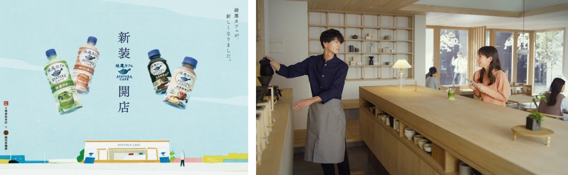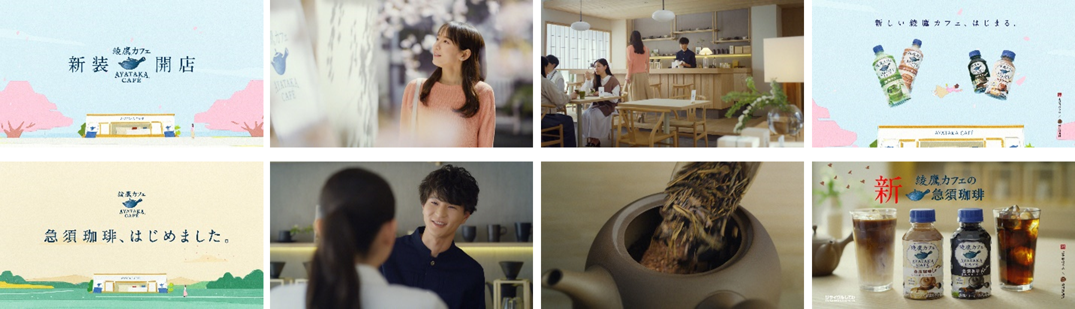 コカ・コーラシステムの緑茶ブランド「綾鷹」から誕生し、素材と製法にこだわったカフェメニュー「綾鷹カフェ」シリーズは、今年で3周年を迎えるこの春、新しい装いに“新装開店”します。“新装開店”した「綾鷹カフェ」は、4月3日(月)より新カフェメニュー「綾鷹カフェ 急須珈琲」が新登場するほか、4月10日(月)から「綾鷹カフェ 抹茶ラテ」および「綾鷹カフェ ほうじ茶ラテ」のパッケージデザインを刷新、「綾鷹カフェ ほうじ茶ラテ」の味わいはさらにおいしくなります。また、ブランドアンバサダーである吉岡里帆さんと、新TVCMで「綾鷹カフェ」のマスターとして登場するお笑い芸人モグライダーの芝大輔さんを起用した、新TVCM『新装開店』篇(30秒)を4月4日(火)から全国で放映します。