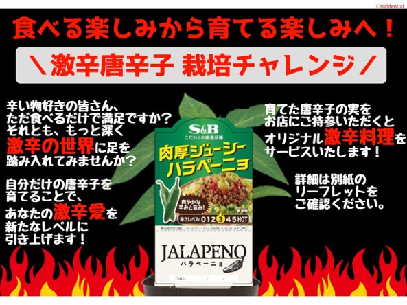 「激辛の聖地」と謳われる唐辛子料理専門店「赤い壺」にて飲食をされたお客さまに、「S&Bハーブ苗」の唐辛子を無料で配布します。また、育てた唐辛子を「赤い壺」に持っていくと、お店で唐辛子料理を作ってもらえます。