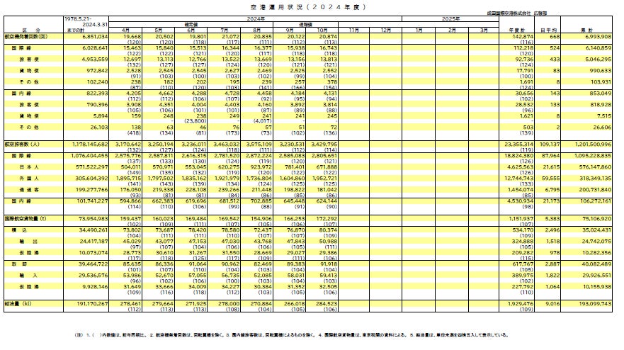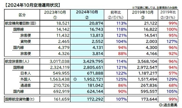2024年10月 空港運用状況 国際線外国人旅客数が195万人で過去最高を更新航空機発着回数がコロナ禍前とほぼ同水準まで回復