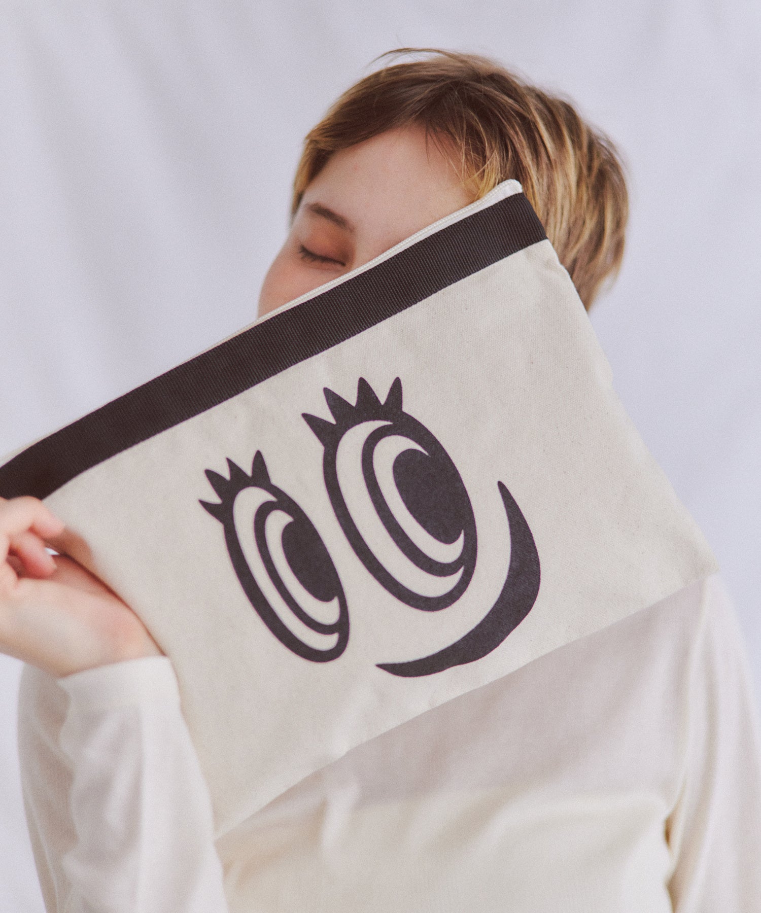 ナカムラくんのチャームポイントでもある大きな目と口をプリントしたポーチは、モノトーンでADAM ET ROPÉらしいモードなエッセンスをプラスしました。