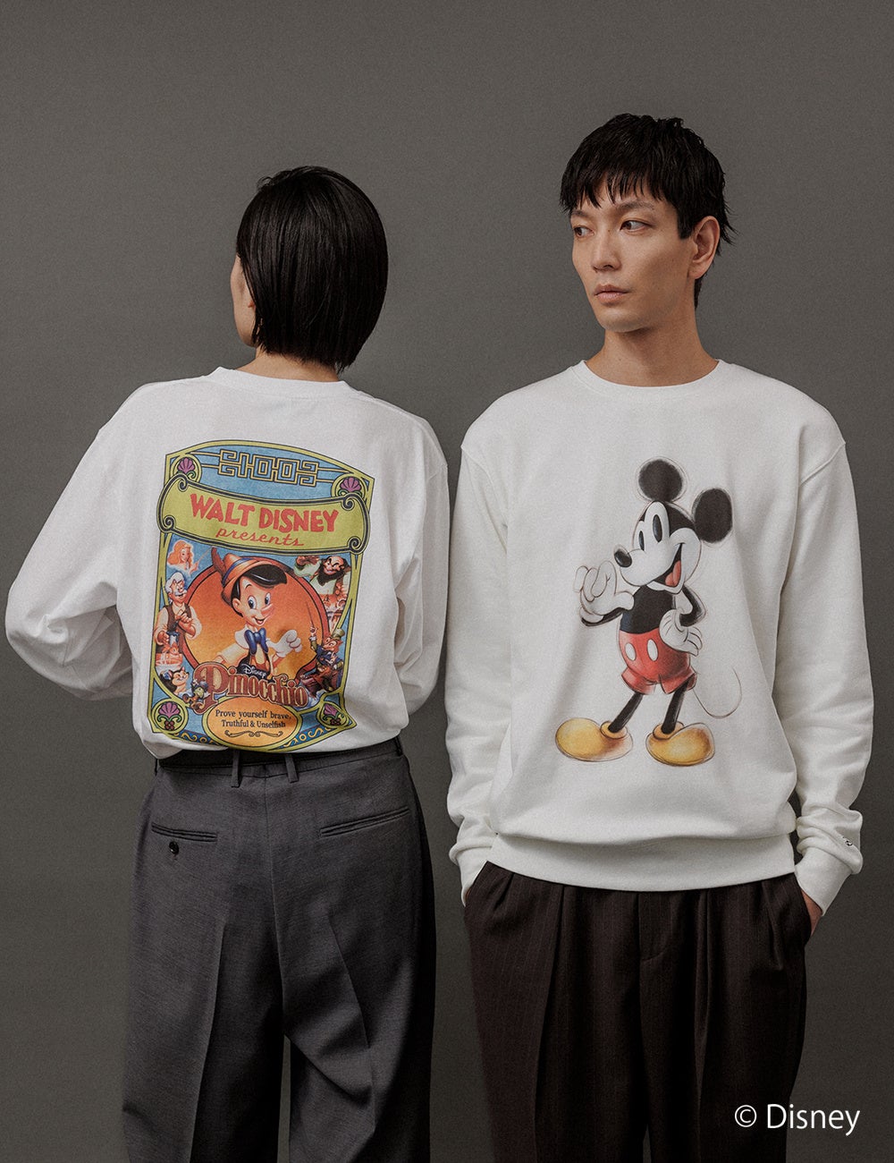 フロントにミッキーマウス、バックにミニーマウスのレトロ感のあるグラフィックのプリント、フロントに映画『白雪姫』に出てくる青い鳥、バックに白雪姫のグラフィックがプリントされた2種類のデザインのコットン素材のスウェットです。