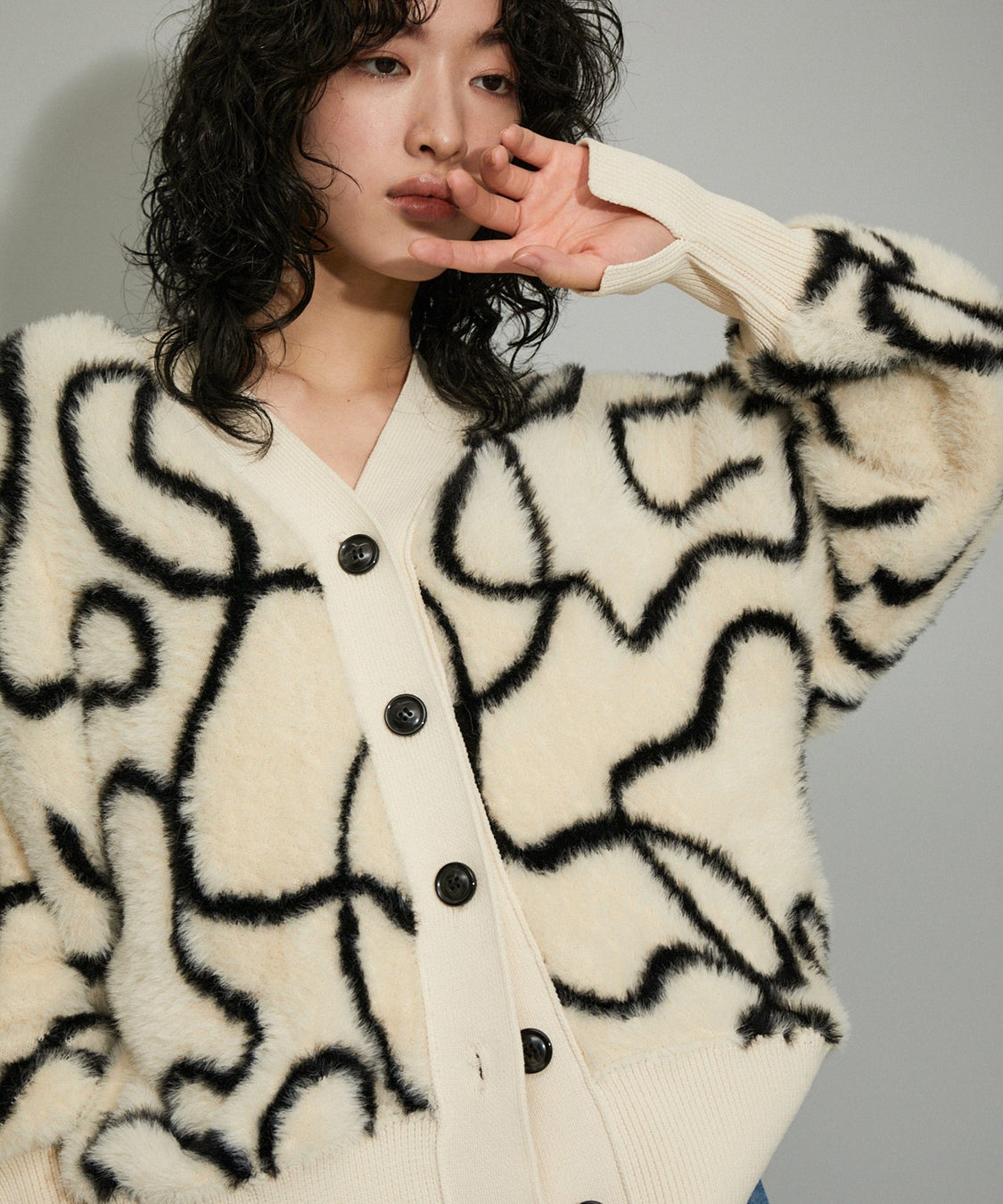 まるでフェザーヤーンのような上品な素材をジャガード編みで仕上げたVネックカーディガン。