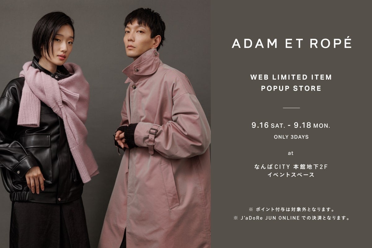 株式会社ジュン(本社:東京都港区/代表:佐々木進)が運営する「ADAM ET ROPE'(アダム エ ロペ)」は、様々なコラボレーションアイテムを含むオンライン限定アイテムを店頭販売するポップアップストアを、9月16日(土)~18日(月)の3日間限定で、なんばCITY本館 地下2階イベントスペースにて開催します。