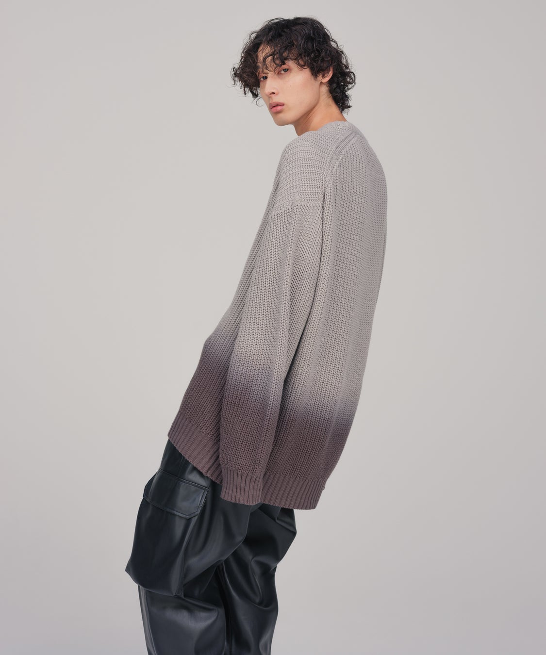 コットン素材のボディに染色を施し、フェードをかけて仕上げたグラデーション、ルーズな設計のアームによるラフな印象が特徴のニット。