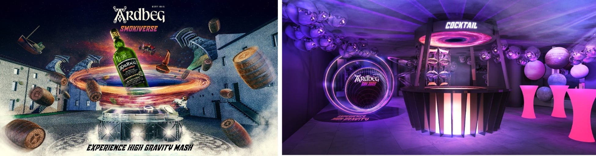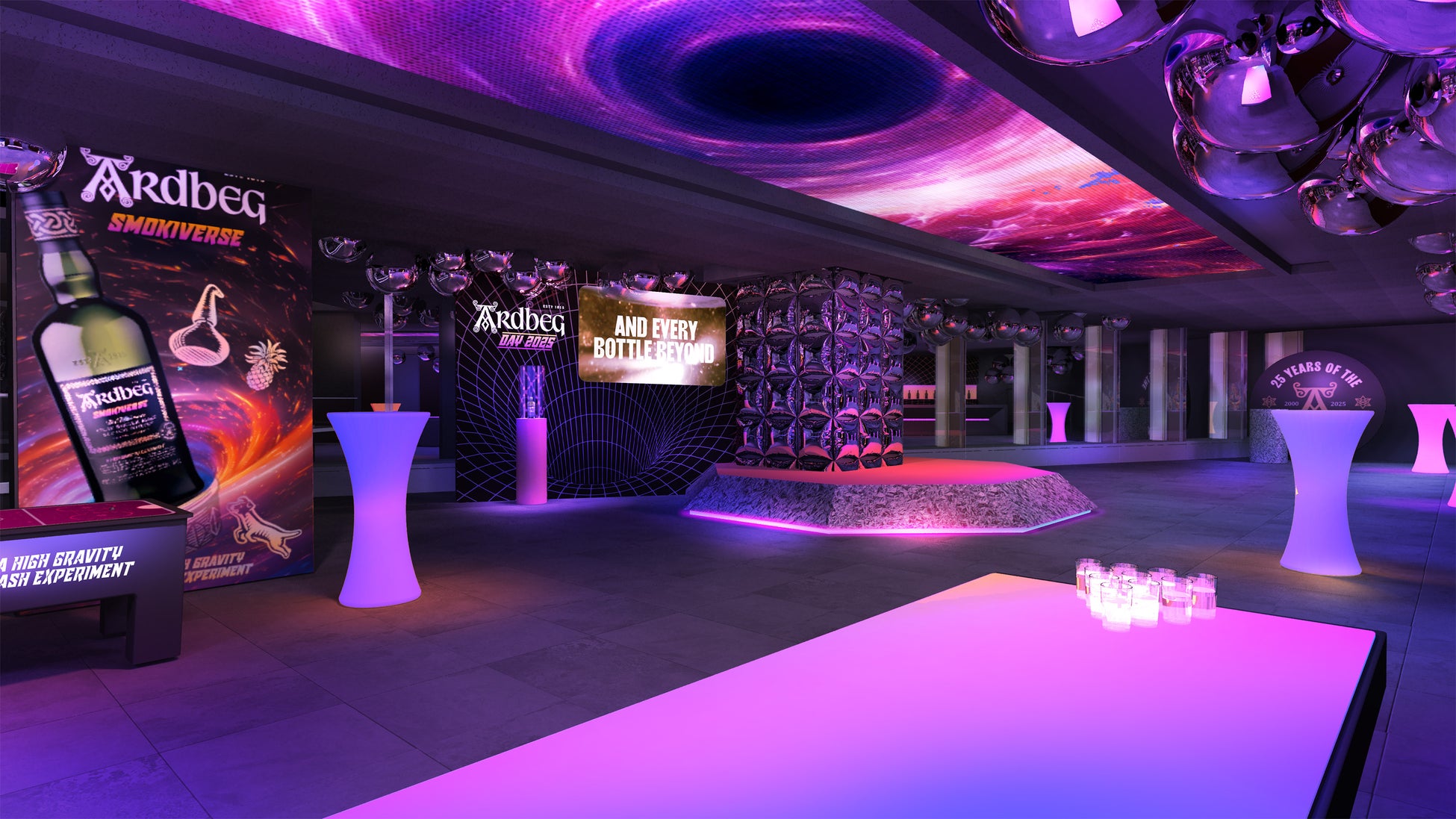 「アードベッグ・デー 2025」は、「高重力(ハイ・グラビティ)実験」のテーマから想起された世界観の中でまるで宇宙のような異次元へ誘う没入型アクティビティと魅力的なコンテンツを多数ご用意しております。「スモーキバース・ポータル」と名づけた宇宙空間へと誘う幻想的な光のリングをくぐり抜けると、渦巻くグラフィックに彩られた輝くウォールが出現。メインエリアには、銀河の煌めきを思わせるネオンカラーの「ザ・ハイグラヴィティ バー」が登場。さらに、「アードベッグ スモーキバース」のテイスティングセッションや、宇宙を彷彿とさせる映像を映し出した巨大なLEDパネルのもとで未来的なDJサウンドに身をゆだねて楽しむ「ギャラクシーダンスフロア」など、五感を刺激する没入空間と体験でファンを魅了します。今年の「アードベッグ・デー 2025」は異次元にスモーキーな味覚の旅を楽しんで!