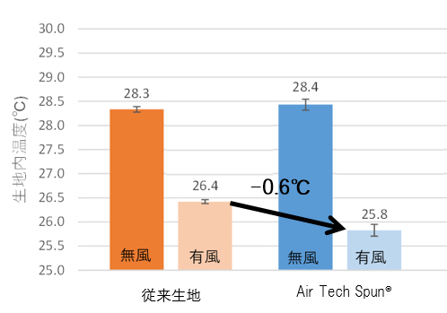 有風時の「Air Tech Spun®」と従来生地では、「Air Tech Spun®」の方が0.6℃生地内温度が低い結果となった。また、生地‐模擬皮膚間において、風を当てることで「Air Tech Spun®」で-2.6℃、従来生地で-1.9℃の温度低下が起こる結果となり、従来生地よりも「Air Tech Spun®」のほうが外気の流入が多くなることで衣服内温度が低下しやすいことが示唆された。