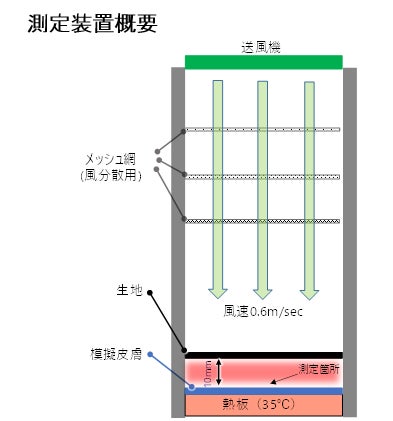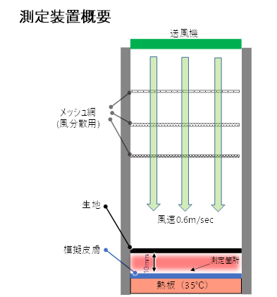 ◇概要:熱板(35℃)上に設置した模擬皮膚から10㎜の間隔を開け、試料を設置し、生地上部より風をあてた時の、生地-模擬皮膚間の温度変化と、模擬皮膚から空間への放熱量を測定。