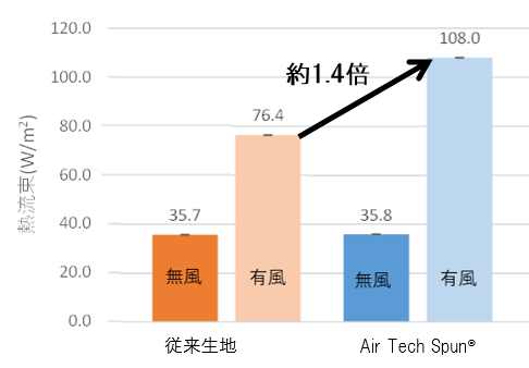 有風時の「Air Tech Spun®」と従来生地では、「Air Tech Spun®」の方が放熱量が約1.4倍高い結果となった。
