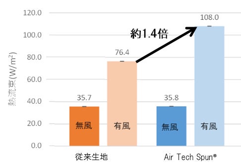 また、風を当てることにより従来生地で2.1倍、「Air Tech Spun®」で3.0倍放熱量が向上する結果となり、従来生地よりも「Air Tech Spun®」のほうが外気の流入が多くなることで衣服内の温度が下がり、皮膚からの放熱量が増加し涼しさを感じやすいことが示唆された。