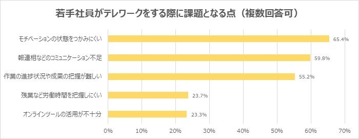 若手社員がテレワークをする際に課題となる点は「モチベーションの状態をつかみにくい」が65.4%で最多。次いで、「報連相などのコミュニケーション不足」59.8%、「作業の進捗状況や成果の把握が難しい」55.2%と続きます。