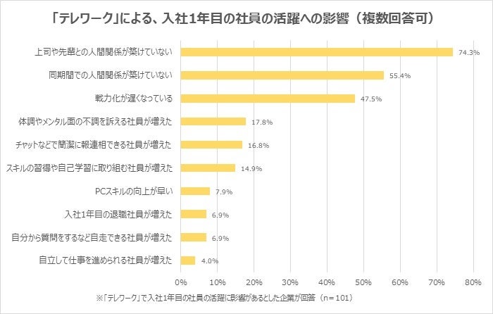 テレワークが入社1年目の活躍に「影響している」の回答が4割を超える。「電話対応など、ビジネスマナーを習得しにくい」「Web会議やチャットだけではコミュニケーションが不足」の声/人事担当者アンケート