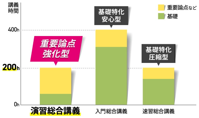 初めて学習される方向けの講義の半分、約200時間に凝縮し、効率よく知識の再確認ができます。これにより、問題演習に多くの時間を充てることができます。