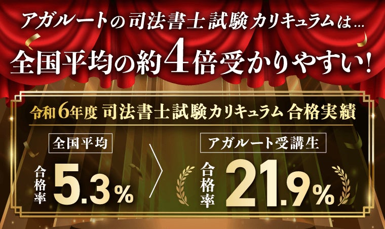 全国平均に比べて「4倍」合格しやすいアガルートの講座。合格特典を目指し、フォロー制度を最大活用しながら、最終合格を勝ち取りましょう!