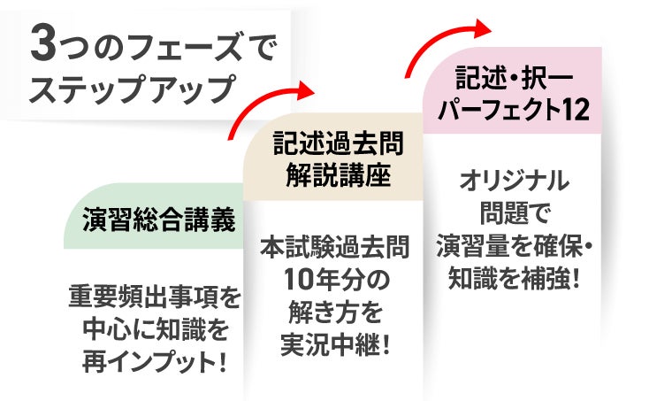 本カリキュラム(フル)には、難易度の異なる記述式対策講座が含まれており、「演習総合講義」「記述過去問解説講座」「記述・択一パーフェクト12」の3段階でステップアップできる構成になっています。