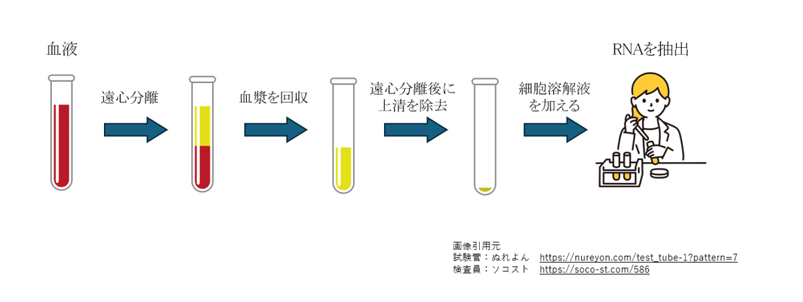 3.2%クエン酸ナトリウム入り採血管で採血した血液を遠心分離をした後、血漿を回収する。回収した血漿をさらに高速度で遠心分離し、細胞成分を沈殿させる。上清を除去した後、細胞溶解液を加えて細胞塊がなくなるまで攪拌し、その後RNAを抽出する。