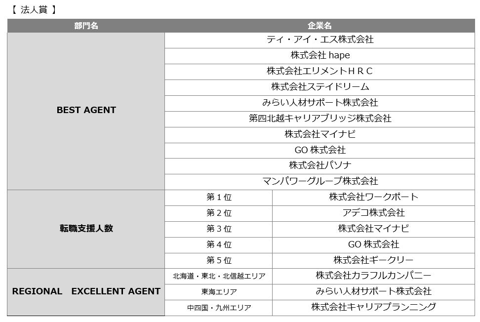 ・REGIONAL EXCELLENT AGENT:「北海道・東北・北信越」「東海」「中四国・九州」エリアに本社のある、転職支援数が優れた転職エージェントを選出