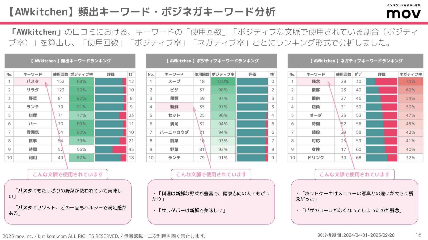 こちらの表では、「AWkitchen」の口コミにおける、キーワードの「使用回数」「ポジティブな文脈で使用されている割合(ポジティブ率)」を算出し、「使用回数」「ポジティブ率」「ネガティブ率」ごとにランキング形式で分析しています。