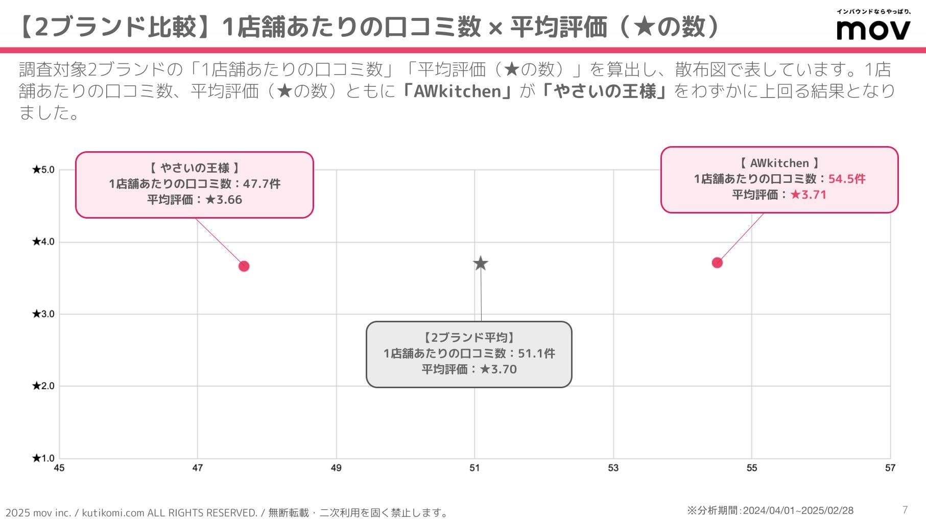 こちらの散布図では、調査対象2ブランドの「1店舗あたりの口コミ数」「平均評価(★の数)」を算出しています。1店舗あたりの口コミ数、平均評価(★の数)ともに「AWkitchen」が「やさいの王様」をわずかに上回る結果となりました。
