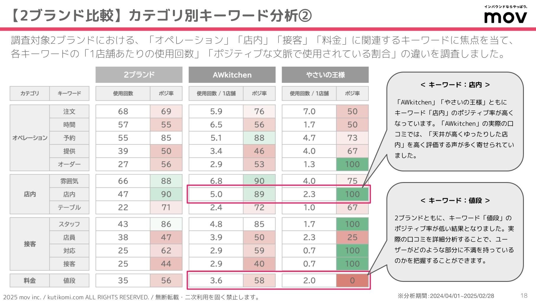 こちらの表では、調査対象2ブランドの「オペレーション」「店内」「接客」「料金」に関連するキーワードに焦点を当て、各キーワードの「1店舗あたりの使用回数」「ポジティブな文脈で使用されている割合」の違いを調査しています。