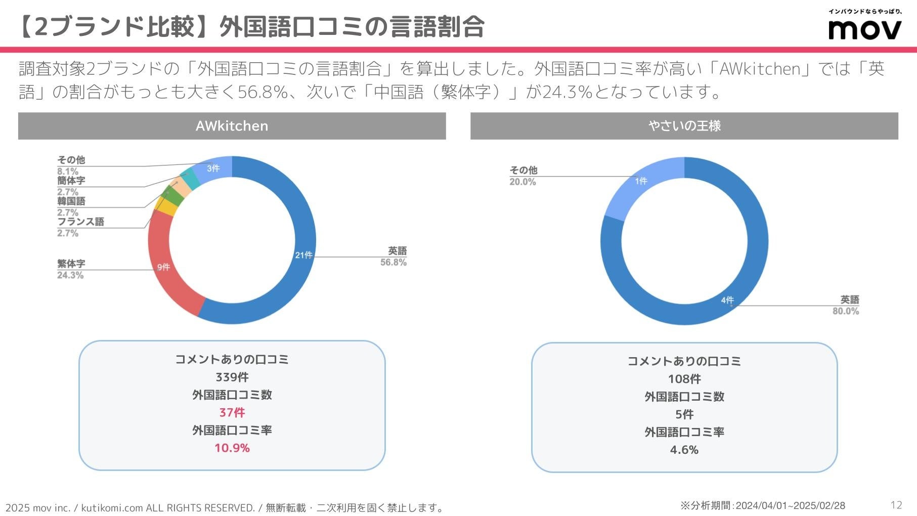こちらのグラフでは、調査対象2ブランドの「外国語口コミの言語割合」を算出しています。外国語口コミ率が高い「AWkitchen」では「英語」の割合がもっとも大きく56.8%、次いで「中国語(繁体字)」が24.3%となっています。