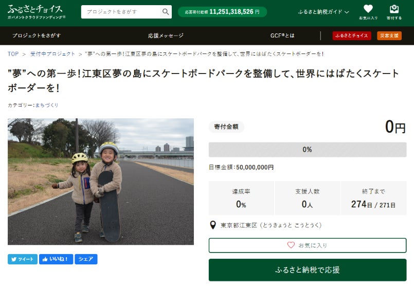 江東区とふるさと納税総合サイト「ふるさとチョイス」( https://www.furusato-tax.jp/ )を企画・運営する、株式会社トラストバンク(本社:東京都渋谷区、代表取締役:川村憲一、以下「トラストバンク」)は、2月3日、トラストバンクが提供するふるさと納税制度を通じてクラウドファンディング型で寄付を募る仕組み「ガバメントクラウドファンディング®」(以下GCF®)で、夢の島にスケートボードパークを整備するためのプロジェクトを開始します。募集期間は2022 年2月3日~10月31日で、目標寄付金額は5,000万円です。