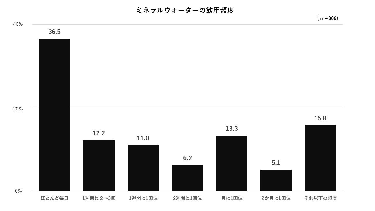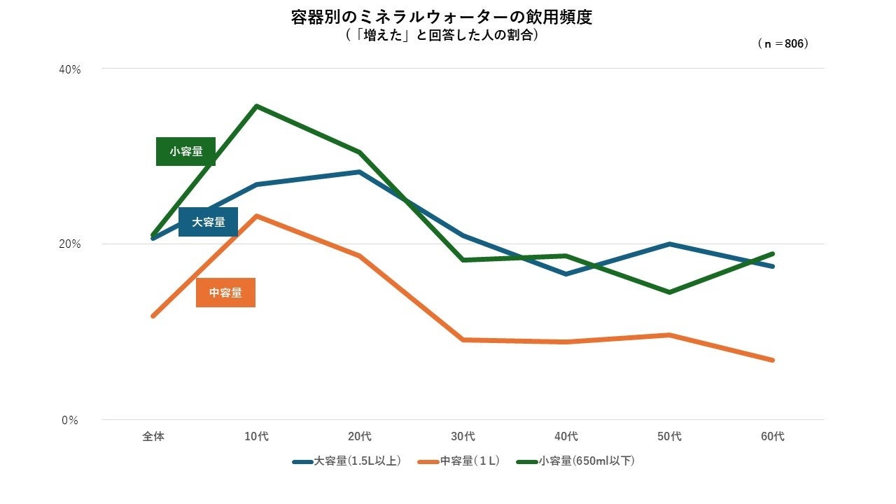 ・ミネラルウォーターの飲用(利用)頻度は、「ほとんど毎日」が最も多く、36.5%でした。容器別の飲用(利用)頻度では、全容量において、10代~20代の飲用頻度が増加傾向にあり、特に中容量・小容量においてはその傾向が顕著に見られました。若年層を中心にパーソナルサイズの需要が拡大しているものと見られます。