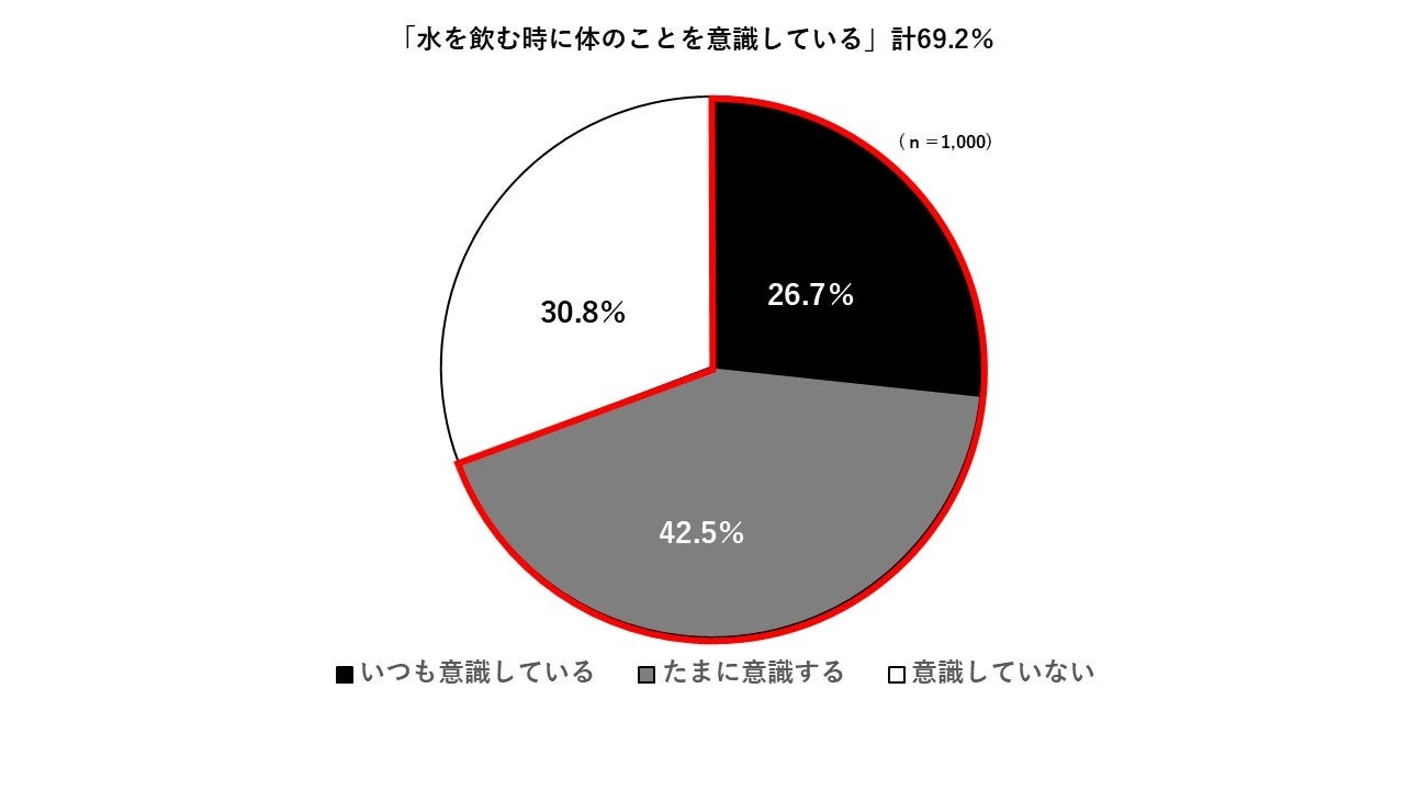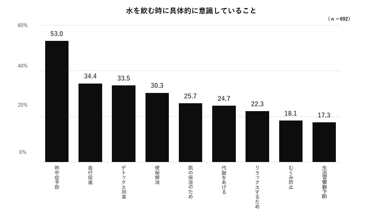 ・「水を飲む時に体のことを意識している」人は約7割(69.2%)でした。具体的な理由として、「熱中症予防」が最も多く挙げられた一方、「デトックス効果」「肌の保湿」なども理由として挙げられ、特に女性は健康や美容への意識と結び付く傾向が見られました。