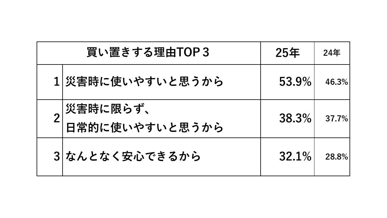 ・「ミネラルウォーターの買い置きがある」人は64.2%となり、理由として、「災害時に使いやすいと思うから」(53.9%)、「災害時に限らず、日常的に使いやすいと思うから」(38.3%)、「なんとなく安心できるから」(32.1%)の3項目が上位に挙がりました。さらに、昨年に比べ、「災害時に使いやすい」「何となく安心できる」という理由が大きく上昇。防災意識の高まりから水の備蓄が一般的となり、水分補給に限らない水の用途が広がっていると考えられます。