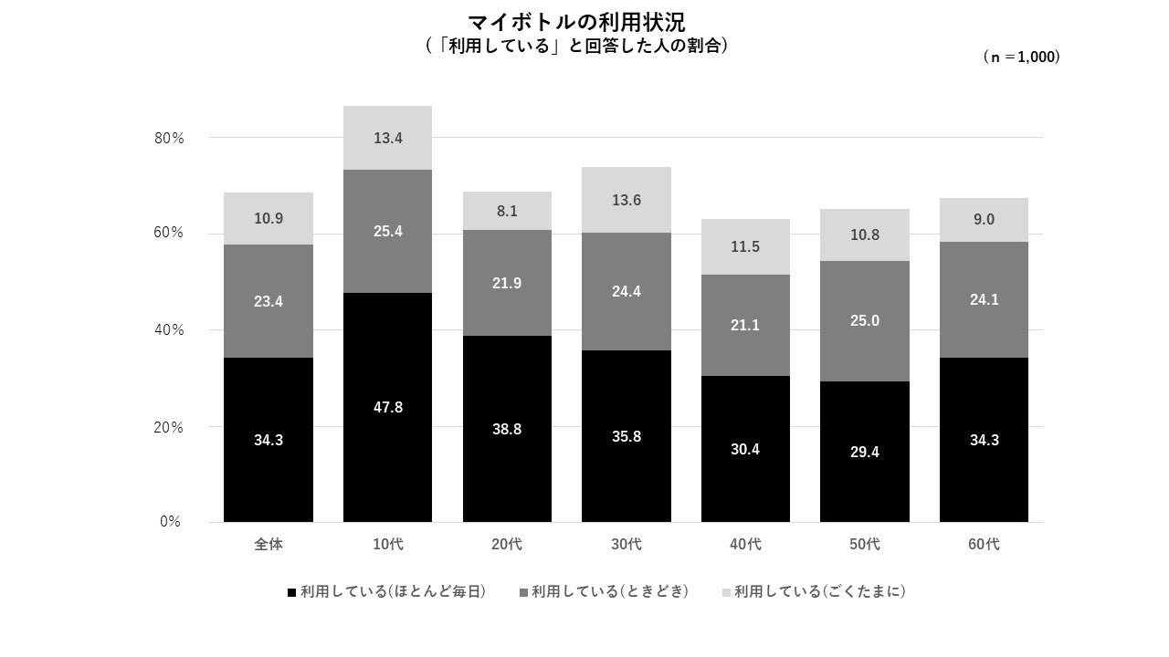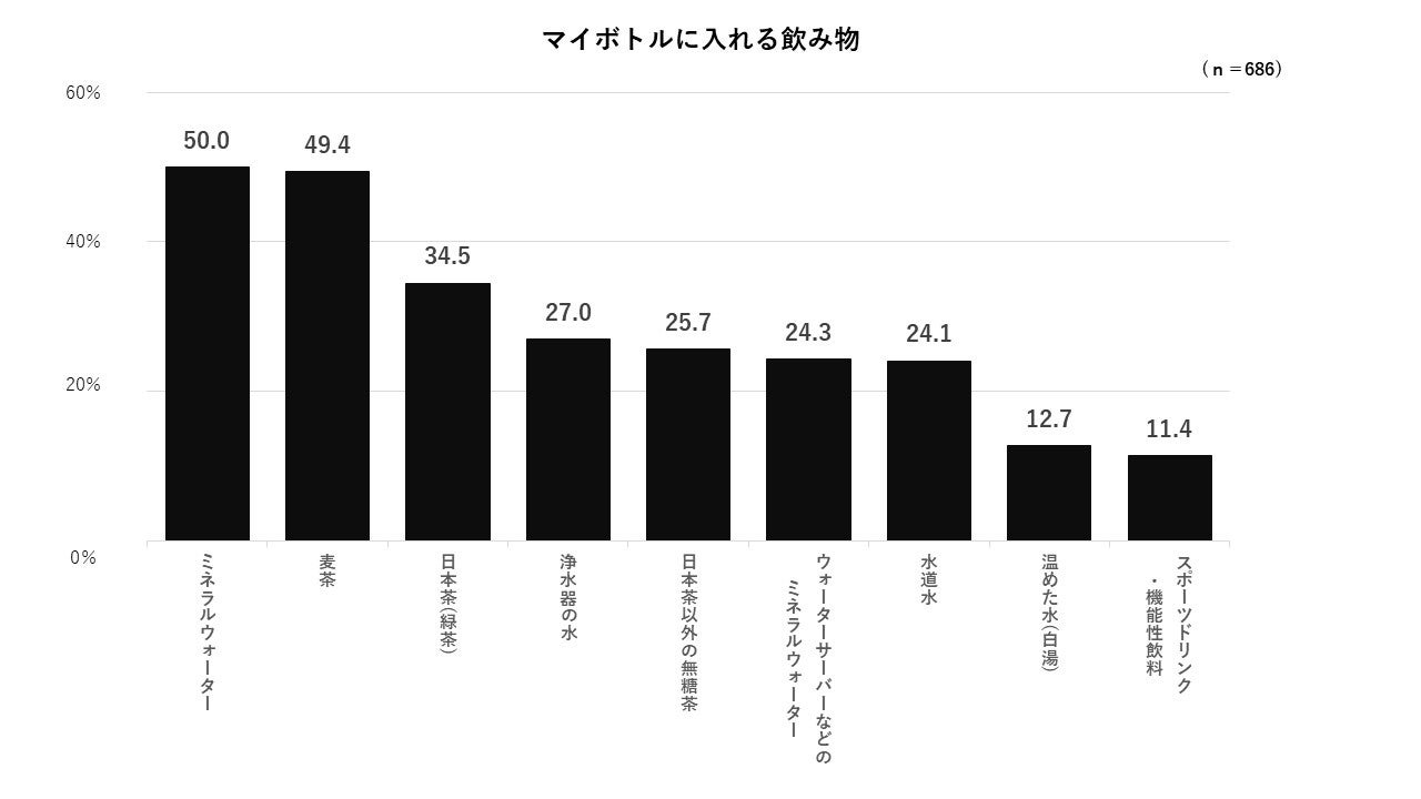 ・今回新たにマイボトル利用状況を調査したところ、約3割(34.3%)以上が「利用している(ほとんど毎日)」と回答し、「利用している(ごくたまに)」まで含めると、約7割(68.6%)の利用状況でした。また、年代別では10代(86.6%)が最も高いことが分かりました。さらに、マイボトルに入れる飲み物は「ミネラルウォーター」(50.0%)が最多でした。ミネラルウォーターを好きな容量や冷たいままの状態で持ち歩きたいといったニーズがあるものと考えられます。