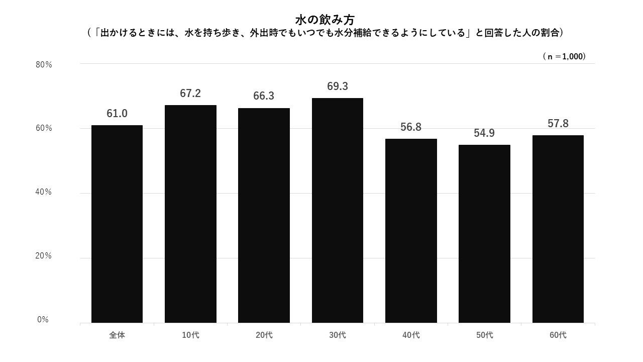 また、「出かけるときには、水を持ち歩き、外出時でもいつでも水分補給できるようにしている」人の割合は、全世代の中でも特に10代~30代のスコアが高く、若年層は飲用水の持ち歩きニーズが高いことが分かりました。