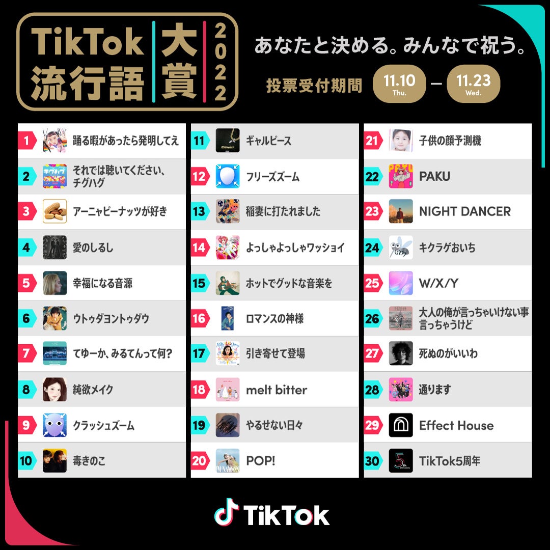 ショートムービープラットフォーム「TikTok(ティックトック)」は、本日、2022年にTikTokで流行したワード、「TikTok流行語大賞2022」ノミネート30選を発表いたしました。