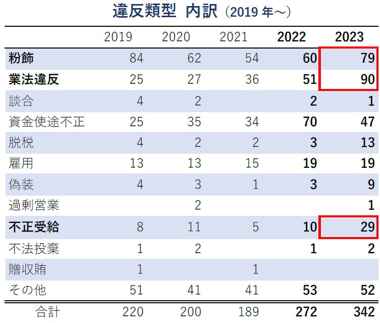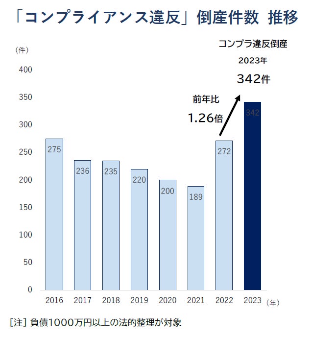 2023年の「コンプライアンス違反倒産」は342件を数え、2022年から70件(前年比25.7%)増加し、2年連続で前年を上回った。また、比較が可能な2016年以降で初めて300件を超えた。