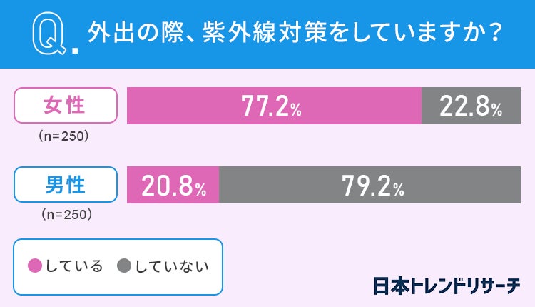 紫外線対策をしているのは女性77.2%、男性は20.8%と大きな差がありました。