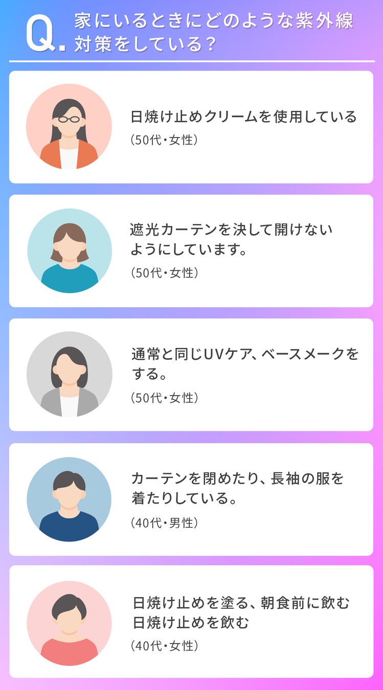 「家にいるときに紫外線対策をしている」のは家の中でも紫外線の影響があると知ったから、といった理由が多くありました。