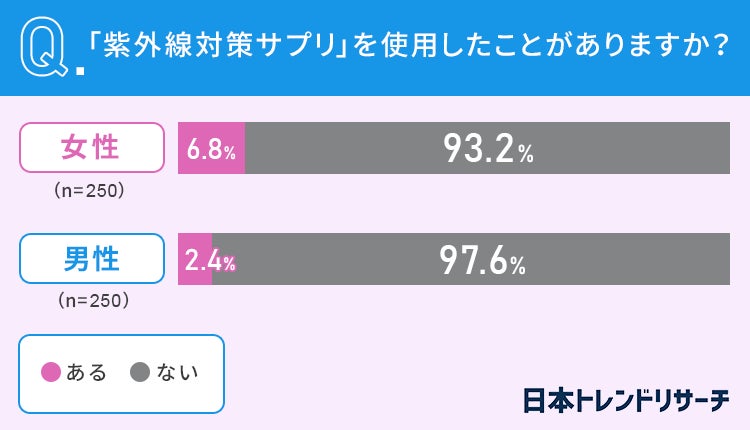 女性の6.8%、男性の2.4%の方が、「紫外線対策サプリ」を使用したことが「ある」と答えました。