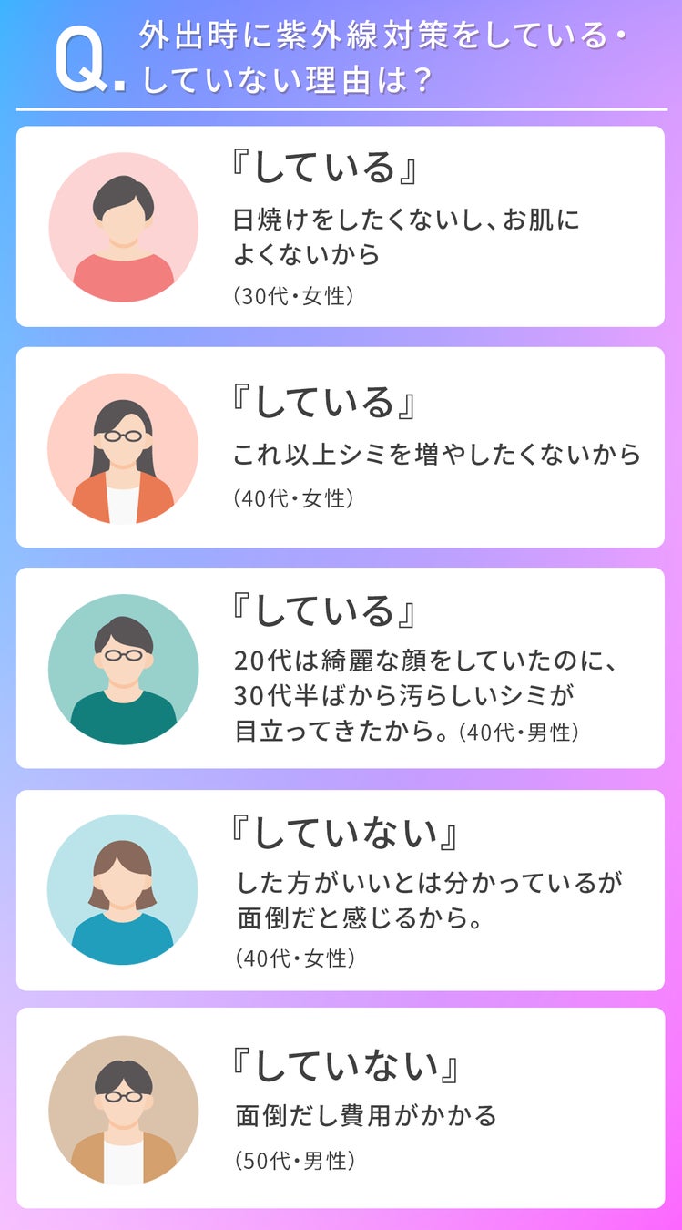 続いて、外出時に紫外線対策をしている・もしくはしていない理由について聞いてみたので紹介します。
