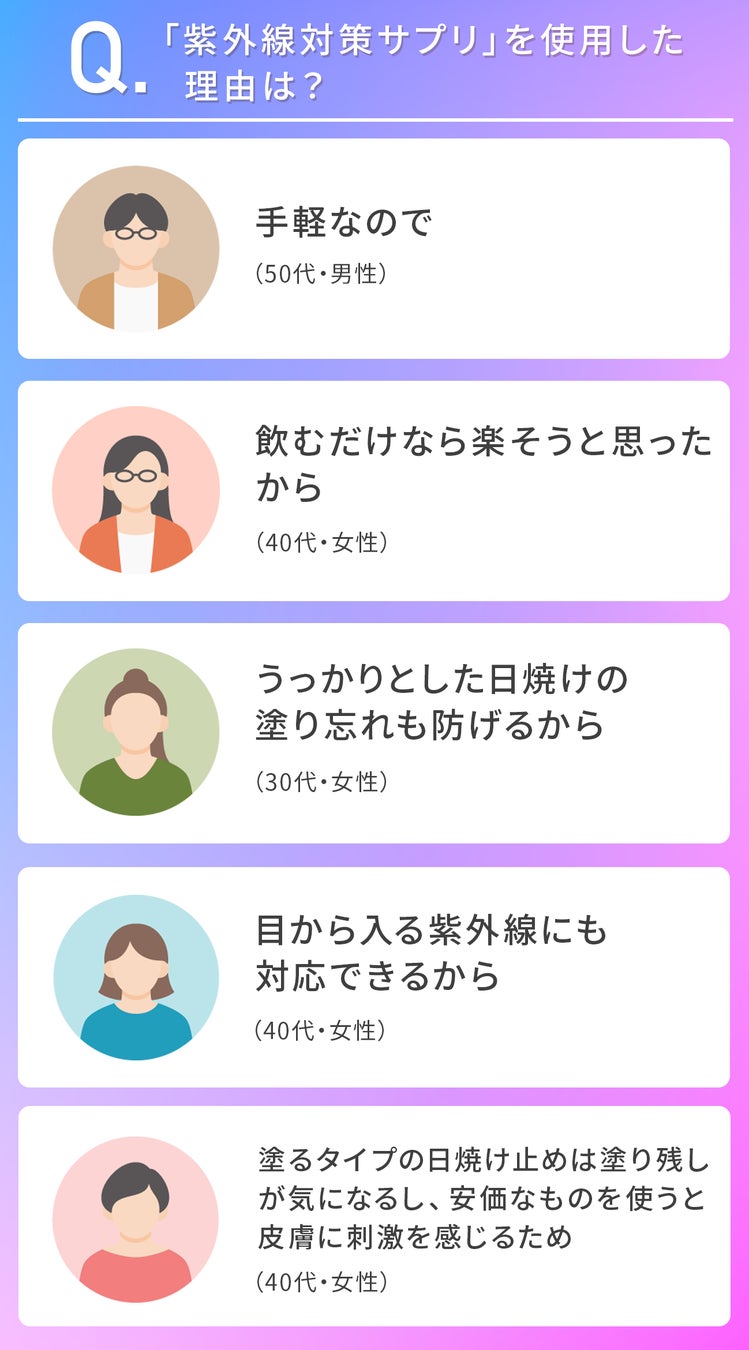 「紫外線対策サプリ」は内側からケアできる点に魅力を感じている方が多くいました。