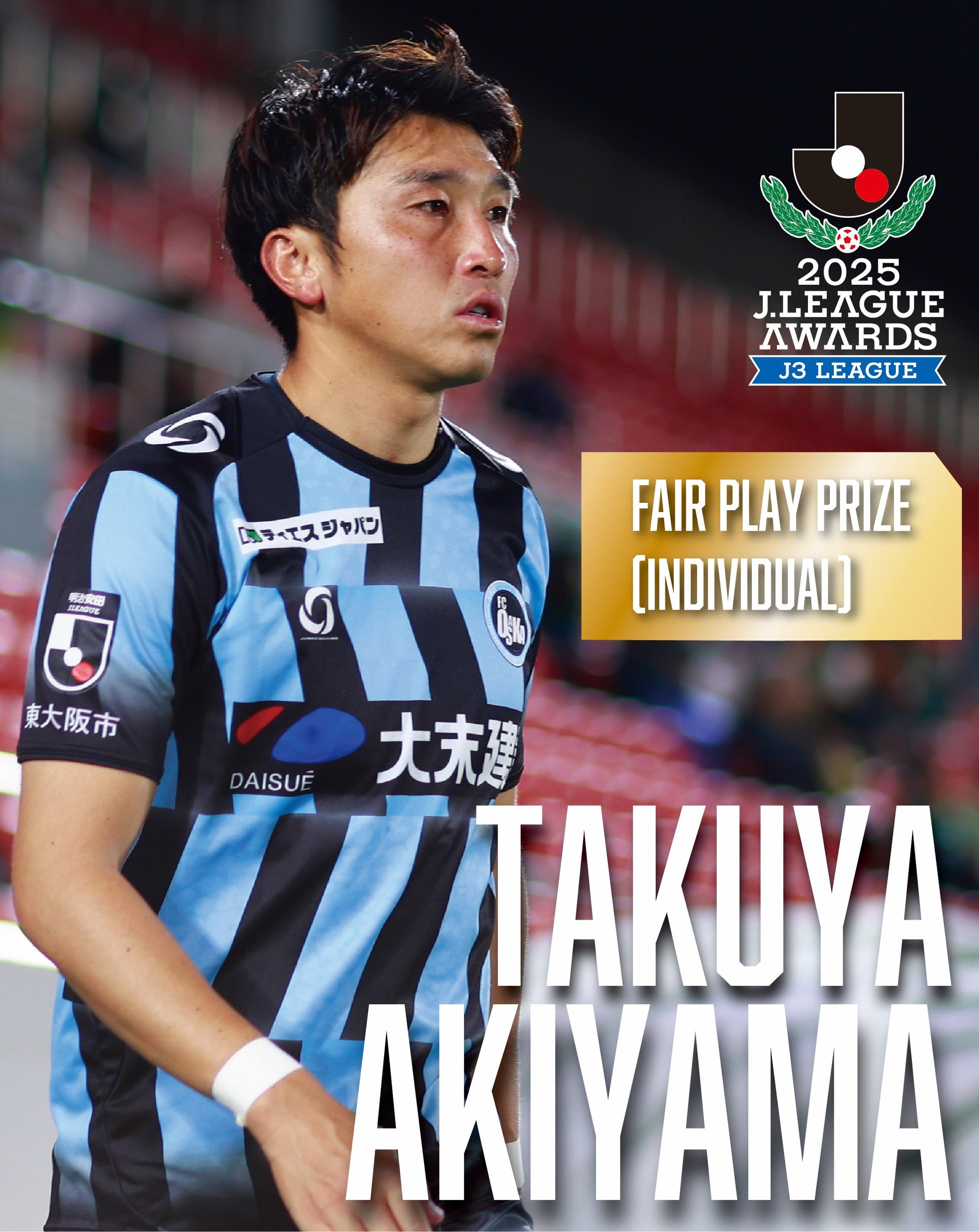 この度、2025 J3リーグ フェアプレー個人賞に秋山拓也選手が選ばれましたので、お知らせいたします。