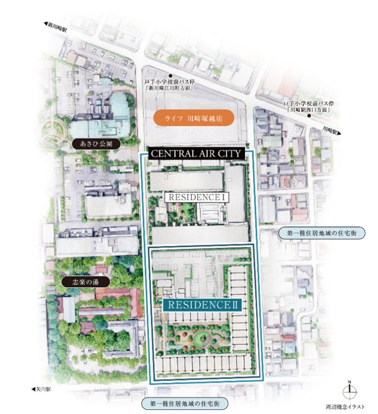 本物件は、2つの街区から構成される、総開発面積16,000㎡超、総戸数474戸のセントラルエアシティ内に誕生します。南武線「矢向」駅から徒歩8分、川崎駅を生活圏として利用できる利便性の高いエリアにあり、スーパーライフが隣接しています。2街区目である「セントラルエアシティレジデンスⅡ」については、2025年4月下旬※1より第1期の販売を予定しております。