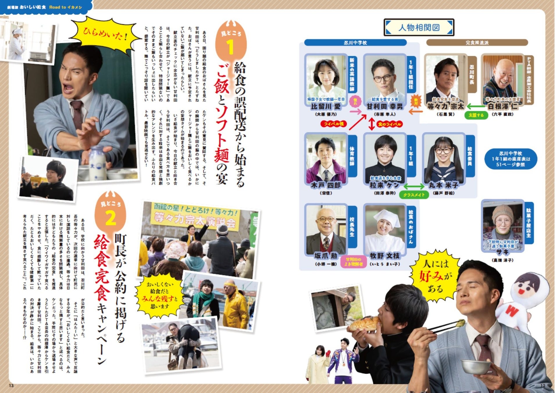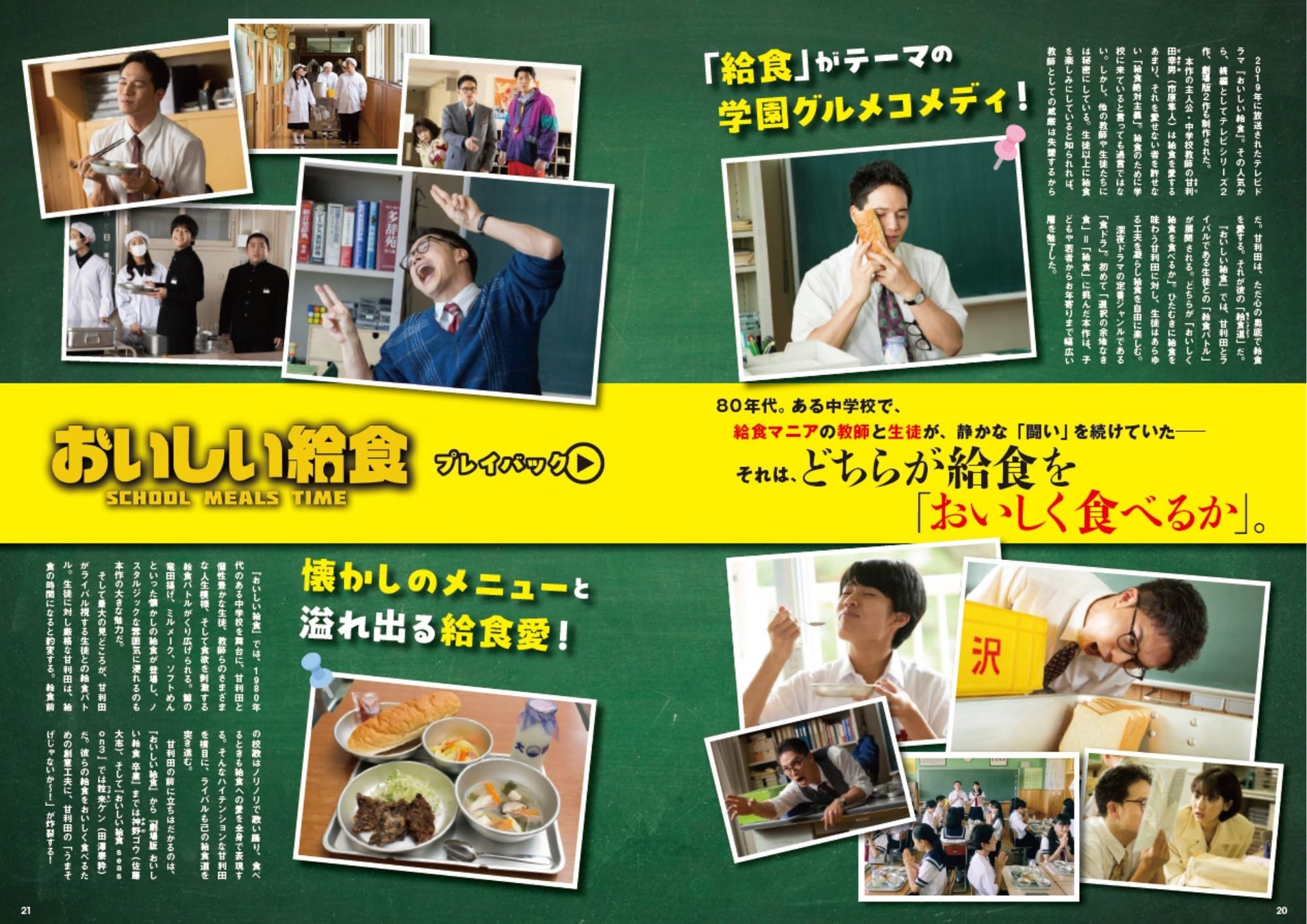 給食を愛する甘利田先生が歩んだこれまでの「給食道」に迫る大特集は必見! これまでのテレビシリーズや劇場作品の全話ガイドに加えて、振り返り視聴する際にも役立つ人物相関図や生徒の座席表なども記載。また全作品で登場した給食メニューの一覧や貴重な撮影オフショットも楽しめます。また巻頭では、主演の市原隼人さんのロングインタビューが読めるほか、最新作のヒロイン比留川先生役の大原優乃さんとのスペシャル対談で撮影舞台裏話も余すことなく掲載しています。